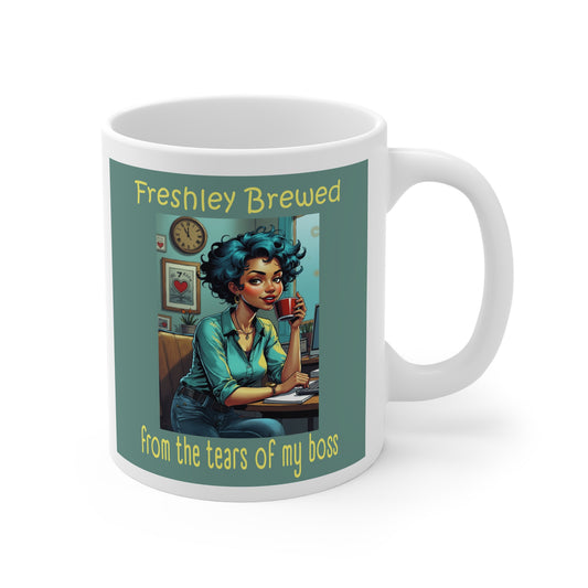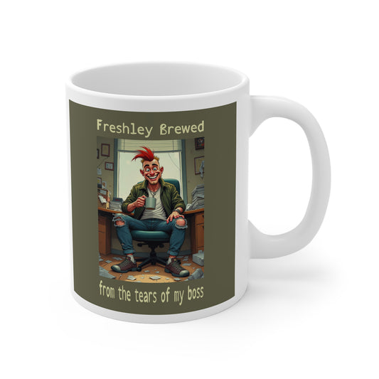 Funny Office Humor Coffee Mug – "Freshly Brewed from the Tears of My Boss"